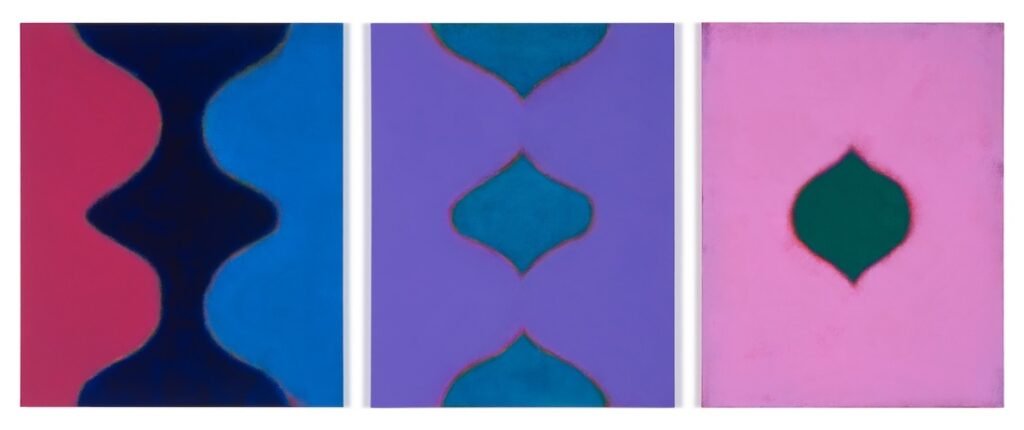 Triptych (as yet untitled), 2025, acrylic and pigment on linen, 42×33″, 42×35″, 42×33″